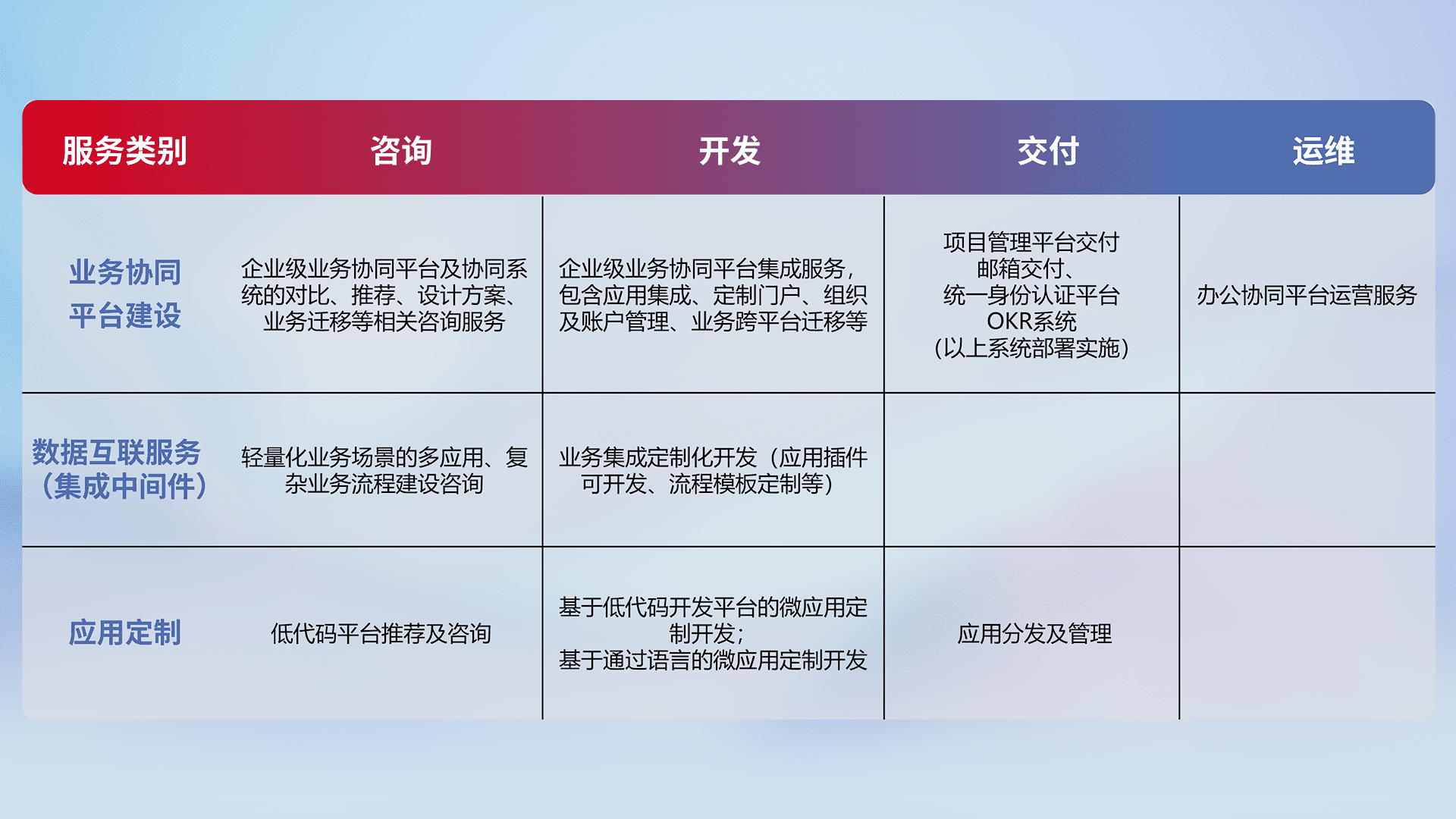 针对钉钉、、企微、、、、IDaas等平台级产品提供产品的规划、、、方案、、交付、、定制化开发等服务,,,,实现如统一协同办公、、智能客户服务、、、、混合会议管理、、、智能数据查询、、、、等业务场景,,,,实现数字化转型。。。